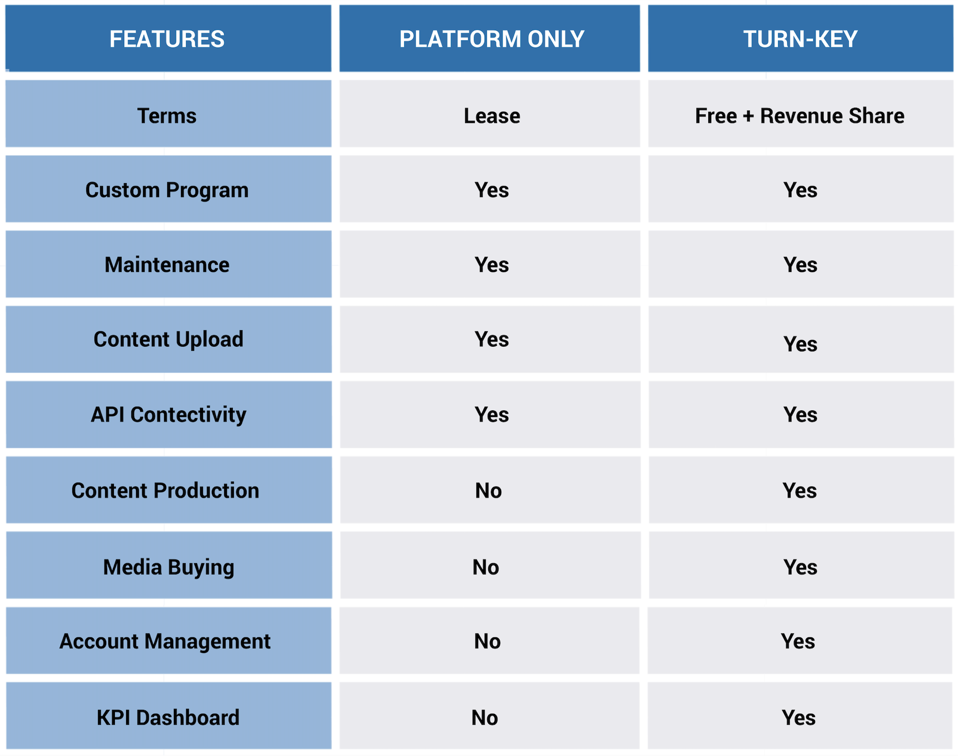 You can lease the platform monthly and have your creative team take full control or leave it completely to us to manage. Whatever works for you,